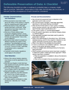 The following checklist provides a roadmap to potential steps a company might take to promote “defensible” preservation of this data. Not all steps are necessary or relevant, but the consequences of each should be considered: